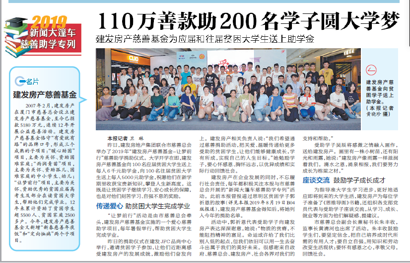 8月26日下午,建发房地产集团联合厦门市慈善总会举办了2019年“建发房产慈善基金-让梦前行”慈善助学捐助仪式,有关方面代表共80多人参加了本次活动。